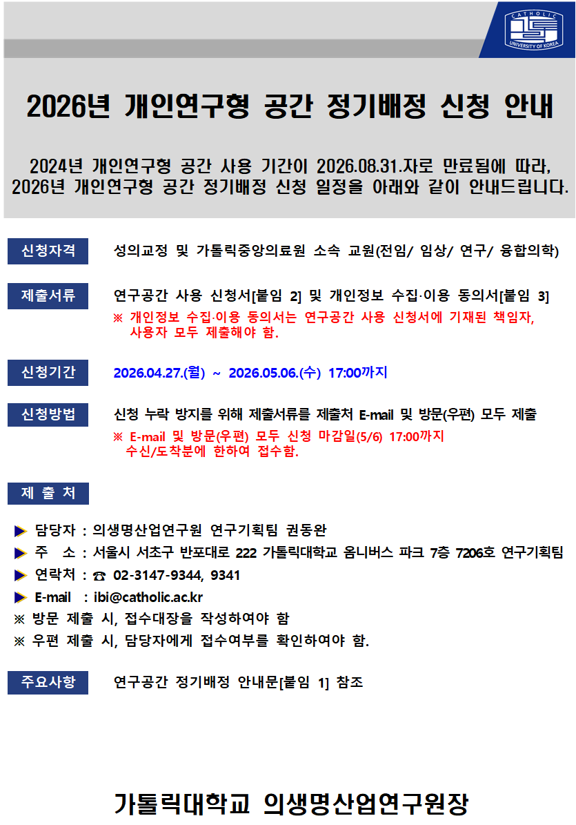 [안내] 2026년 개인연구형 공간 정기배정 신청 안내 (~5/6(수) 17:00까지)